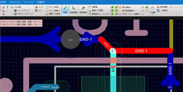 そのため、BPネットの配線とGND-1ネットの配線でクリアランス違反となっております。