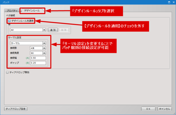 今回のように特定のパッドについてサーマルの接続幅などを変更したいということであれば